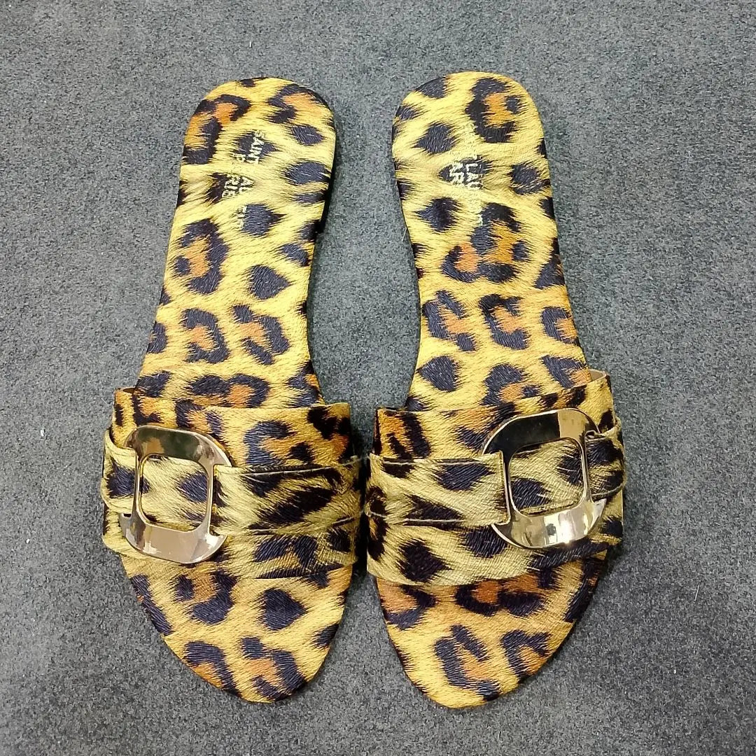 Trendy leopard print ladies slides with soft padded sole, golden buckle design, and ultra-light comfortable feel. Perfect for daily wear, outings, and casual fashion styling