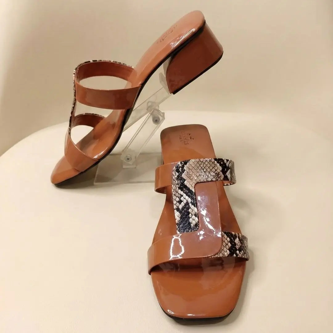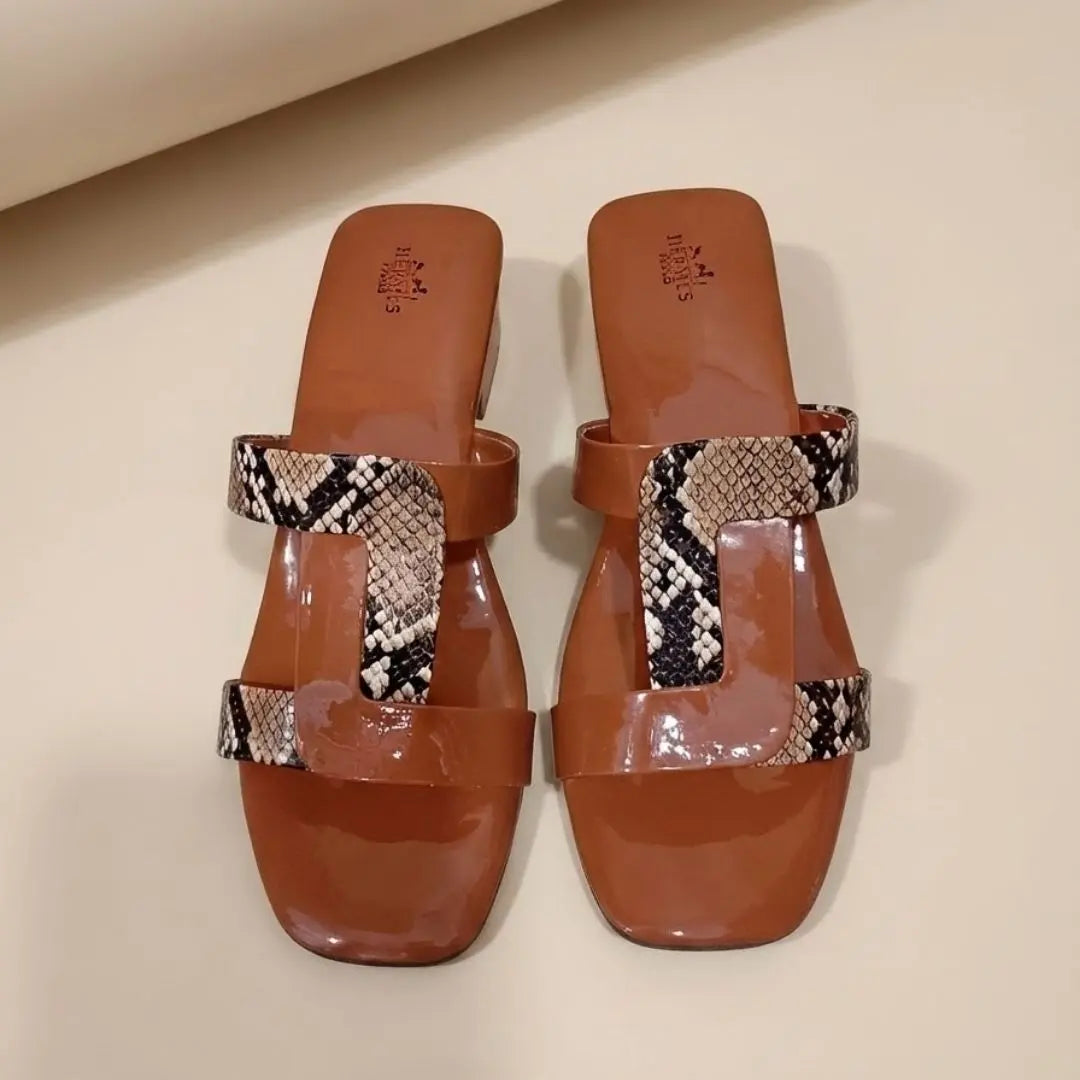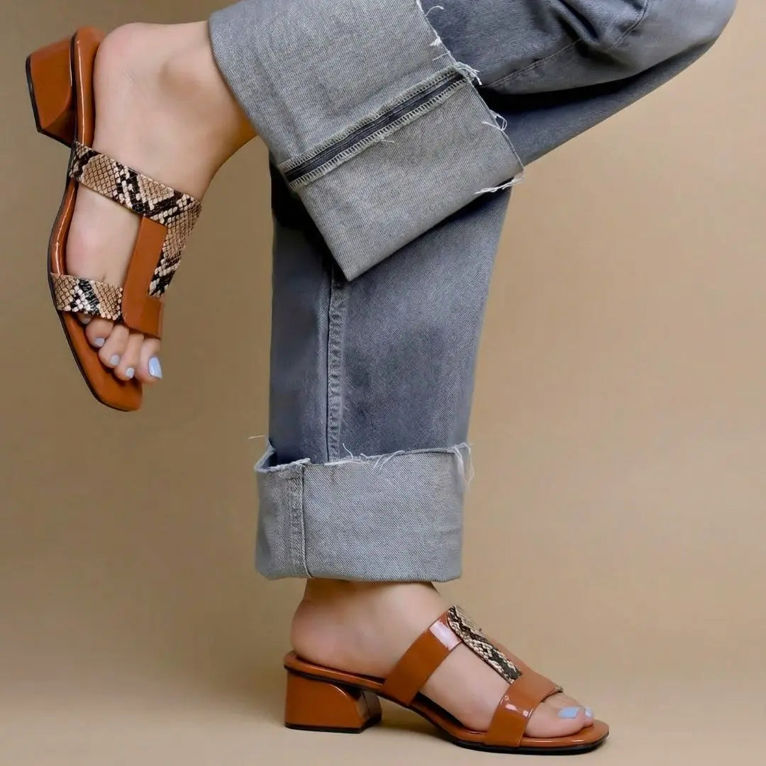 Ayla block heel sandals classy brown color aur snake-print straps ke sath, jo daily wear aur casual outings ke liye perfect choice hain.