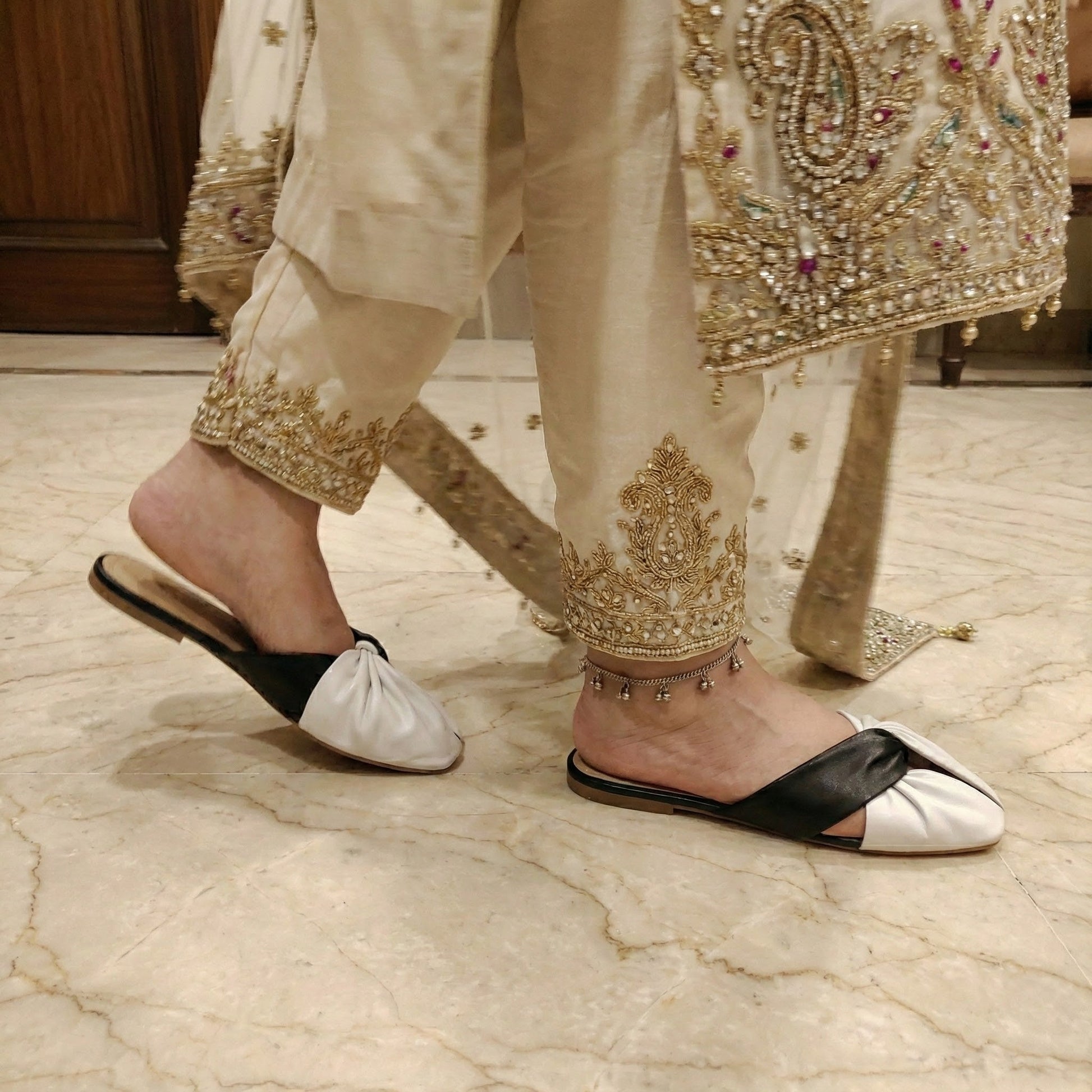 Add a touch of effortless elegance to your everyday look with these stylish white and black slip-on flats. Featuring a soft twisted knot design on the front, these flats offer both comfort and a modern aesthetic. The open-toe and backless style make them easy to wear while keeping you cool and classy. Perfect for casual outings, brunch dates, or even office wear with a fashionable twist.